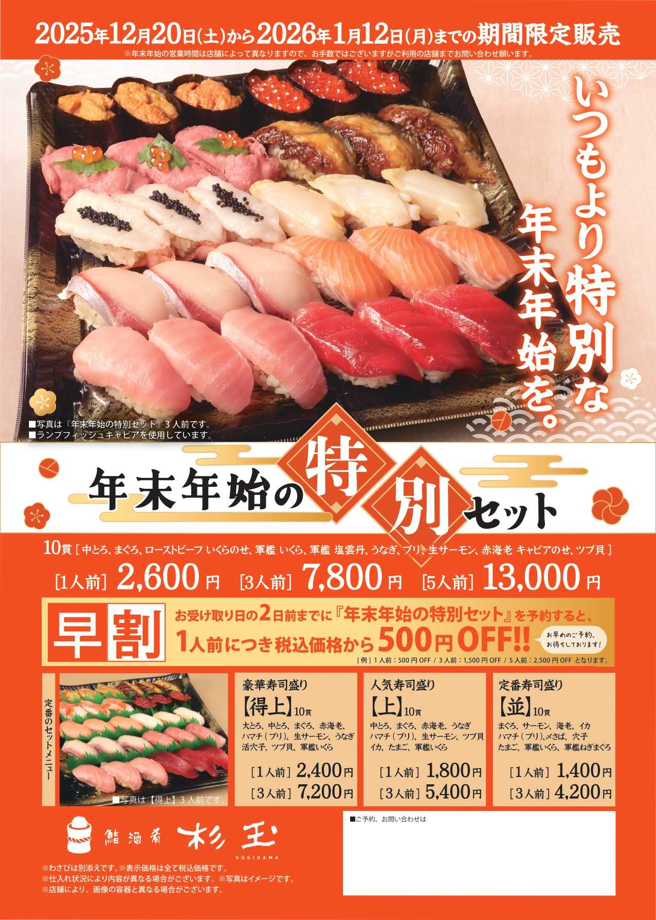 お受け取り日の2日前までに「年末年始の特別セット」を予約すると、1人前につき税込価格から500円OFF!!