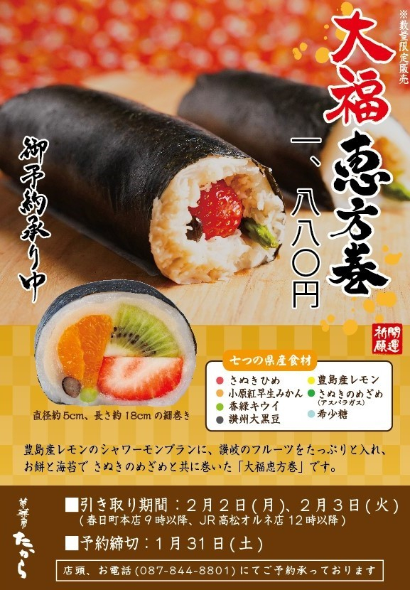豊島レモンのシャワーモンブランに、讃岐のたっぷりフルーツとさぬきのめざめを入れ、お餅と海苔で巻いた【大福恵方巻】です。