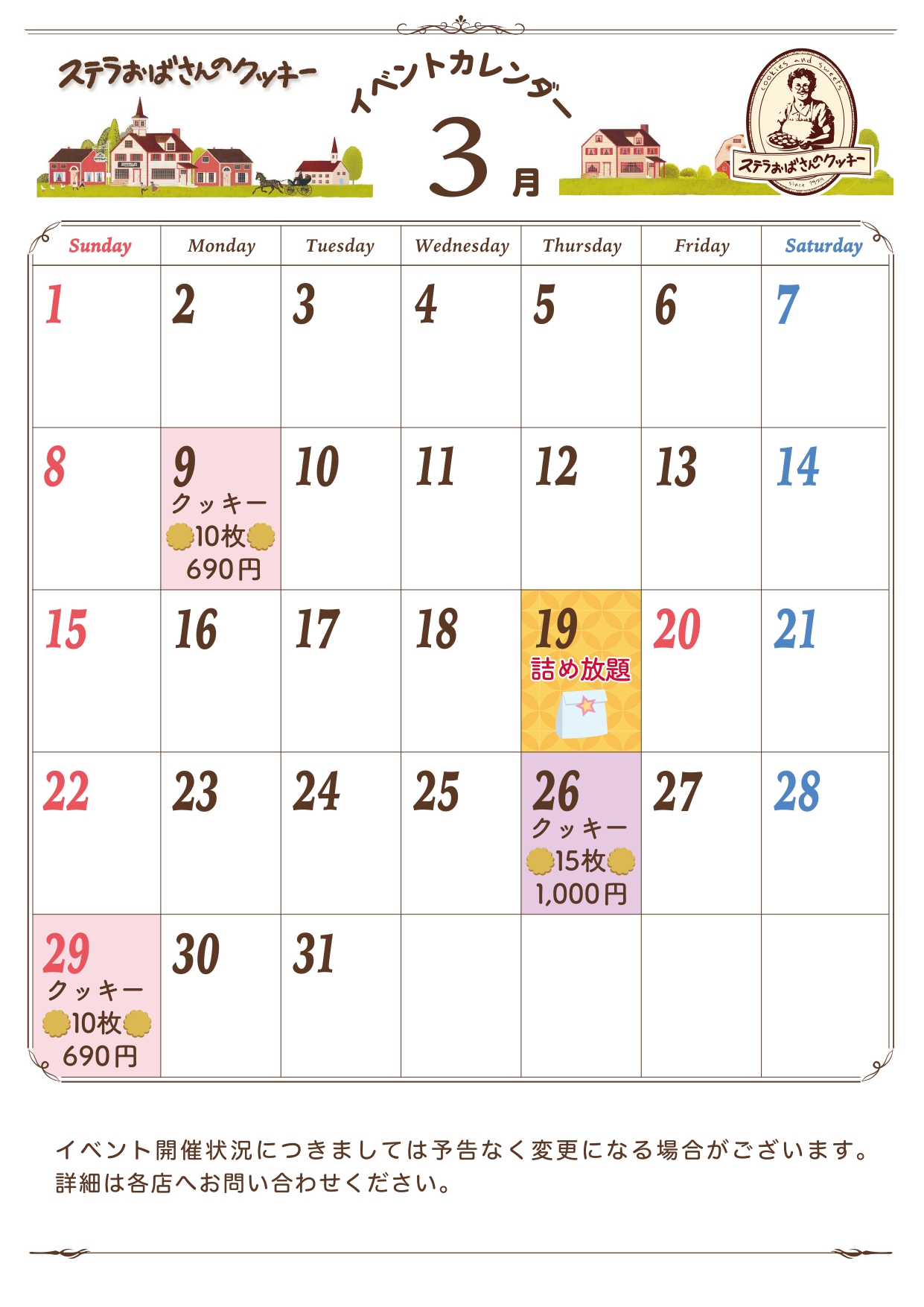 【ステラおばさんのクッキーTAKAMATSU ORNE店 3月イベントカレンダー】