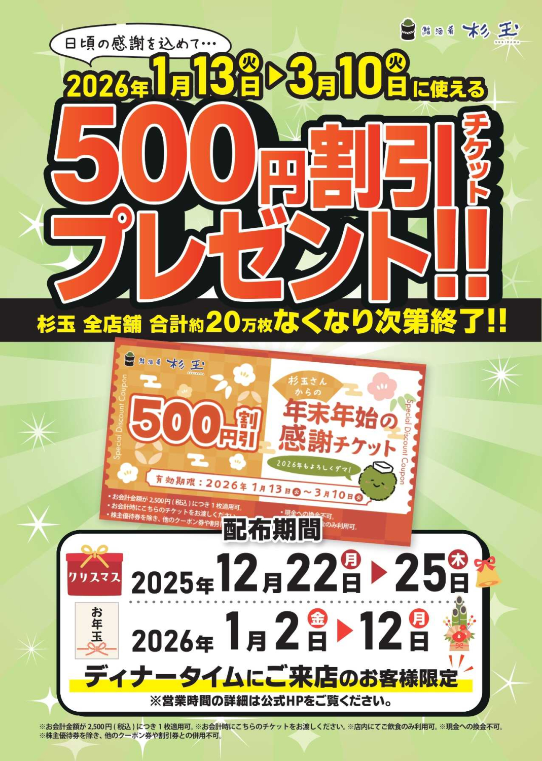 杉玉から日頃の感謝を込めて、500円割引チケットプレゼント!鮨 酒 肴 杉玉